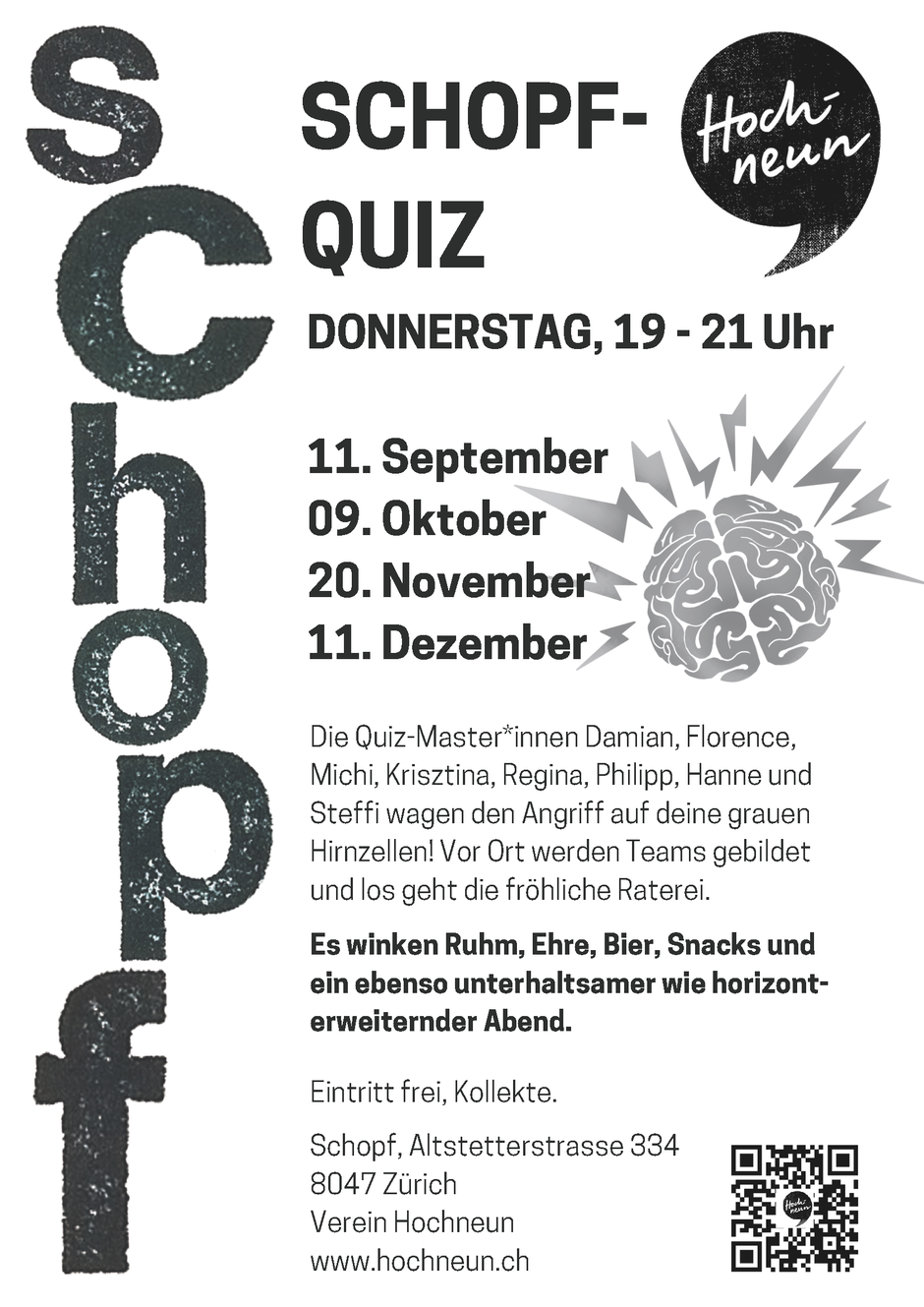 Es läuft rund, bei Hochneun: Jeden Samstag gibt's Kaffee & Kuchen im «Schopf». Folgende Reihen finden regelmässig im «Schopf» statt: Häkel Strick & Krims Krams, Mittagstisch, Schreibwerkschopf, Schopfquiz, Kafi Klatsch mit Fokus, der Lesezirkel, der Fiirabig-Schopf, die Bastelreihe «Heissliim & Glitzer» - dazu im GZ Bachwiesen die Rakete Bar und im Restaurant Farfalla (Mathysweg) das Generationen-Kafi. Siehe «Das läuft»!